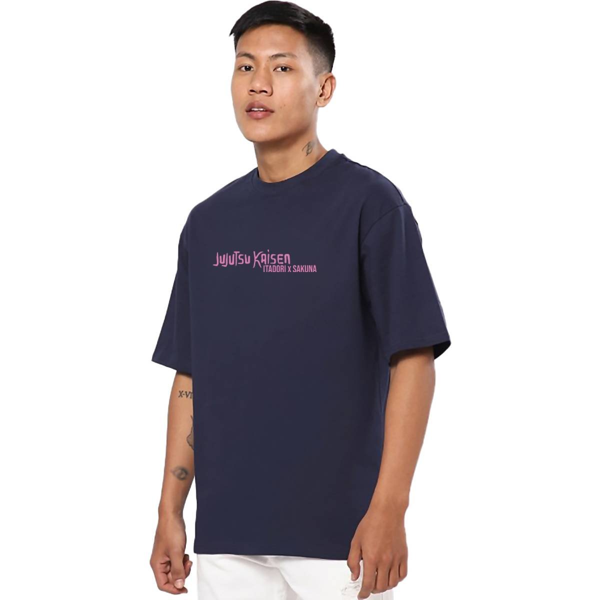 Printsflix Itadori x Sakuna Anime Printed Pure Cotton Round Neck Drop Shoulder Baggy Fit Dark Blue Oversized Tshirt -Unisex