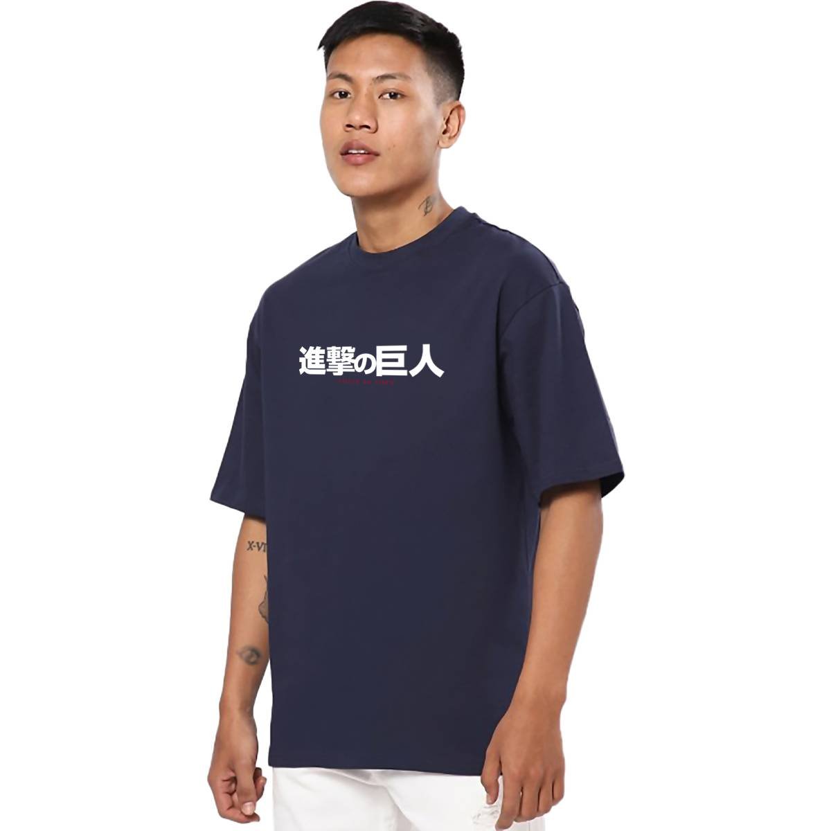 Printsflix Trendy Attack on Titan Anime Printed Pure Cotton Round Neck Drop shoulder loose fit Dark Blue Oversized Tshirt -Unisex