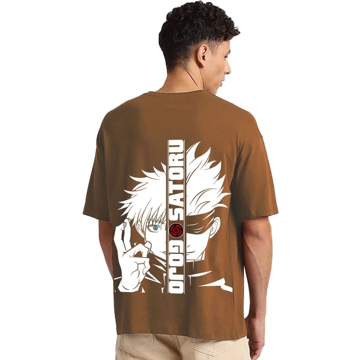 Printsflix Trendy Gojo Satoru Printed Anime Pure Cotton Round Neck Drop Shoulder Baggy Fit Brown Oversized Tshirt -Men/Women/kids/Adults