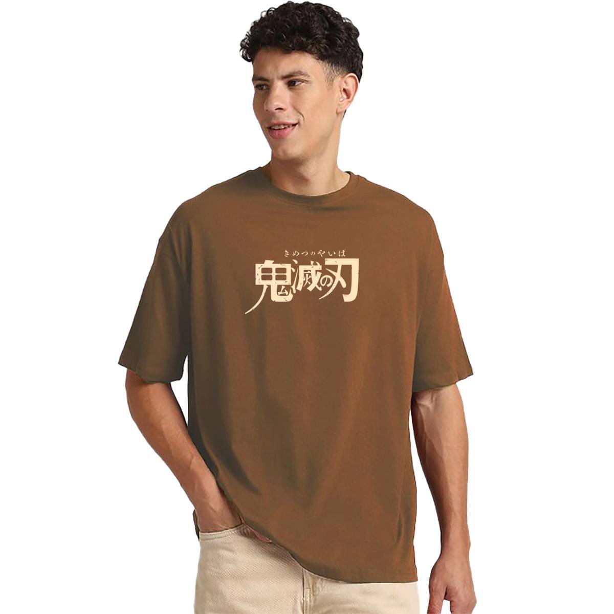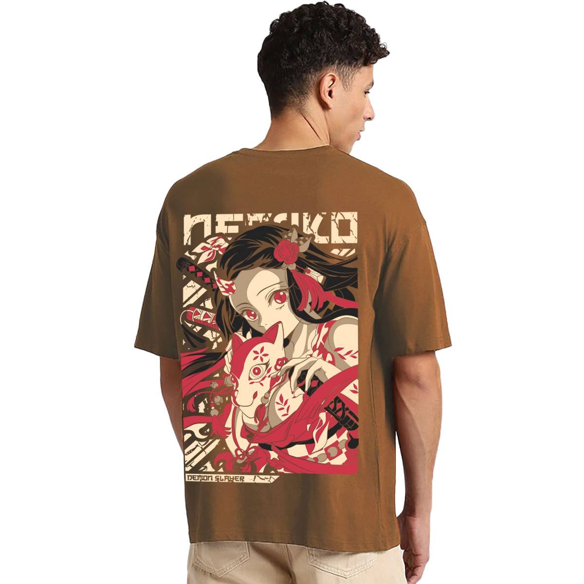 Printsflix Trendy Nezuko Kamado Demon Slayer Anime Printed Pure Cotton Round Neck Drop shoulder Brown Oversized Tshirt -Unisex